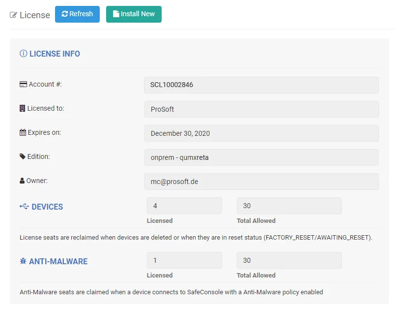 Nach dem Kauf oder der Verlängerung eines Wartungsvertrags für Ihre Datalocker SafeConsole (siehe auch USB-Device-Management) müssen Sie Ihre SafeConsole-Lizenz aktualisieren bzw. neu installieren, um die aktuellen Lizenzinformationen zu berücksichtigen.