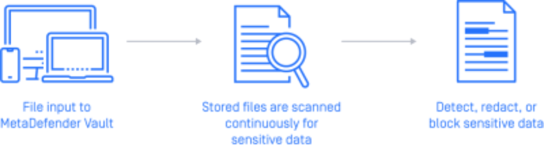 Alle in MetaDefender Managed File Transfer (vormals Vault) gespeicherten Dateien werden kontinuierlich auf vertrauliche Informationen überprüft. Wenn Sie neue benutzerdefinierte Dateitypen basierend auf regulären Ausdrücken festlegen, werden übereinstimmende Informationen automatisch erkannt und redigiert, sobald die Dateien erneut gescannt werden. Scans können regelmäßig oder auf Anfrage durchgeführt werden.