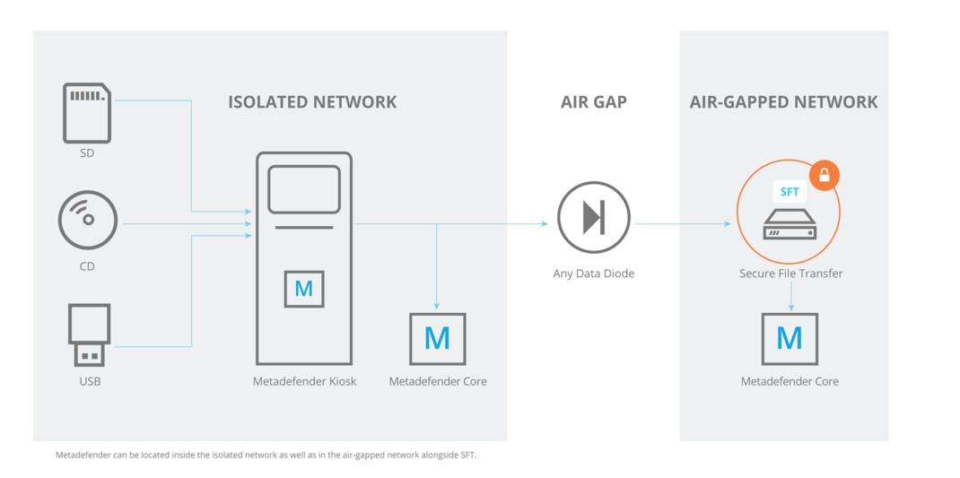 MetaDefender Kiosk Datenschleuse (Wechseldatenträgerschleuse) kann stand-alone ohne und mit Netzwerkanbindung, mit zentralem Management, in Zusammenhang mit einer Datendiode, mit Secure File Transfer (SFT), Vault oder in einer verteilten Infrastruktur eingesetzt werden.
