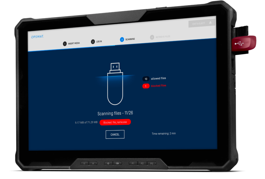 MetaDefender Kiosk scannt vor Zutritt einer kritischen Infrastruktur mobile Datenträger auf Bedrohungen und Schadsoftware, löscht kritische Dateien oder eingebettete Objekte wie Skripte und Makros und speichert die bereinigten Dateien manipulationssicher ab. Das Alleinstellungsmerkmal bei MetaDefender Kiosk ist die hohe Sicherheit durch die parallele Überprüfung durch mindestens 8 bis maximal 30+ AV-Engines. Der neue mobile Notebook-Kiosk scannt auch vor Ort Beweise auf Schadcode aller Art.