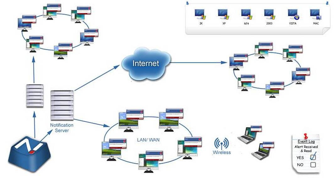 Mit NetSupport Notify können Sie in Echtzeit Benachrichtigungen und Alarme (Alerts) über LAN oder WAN zuverlässig und nachweislich an Windows-, macOS-, Linux-, Chrome- sowie iOS- und Android-Geräte senden.
