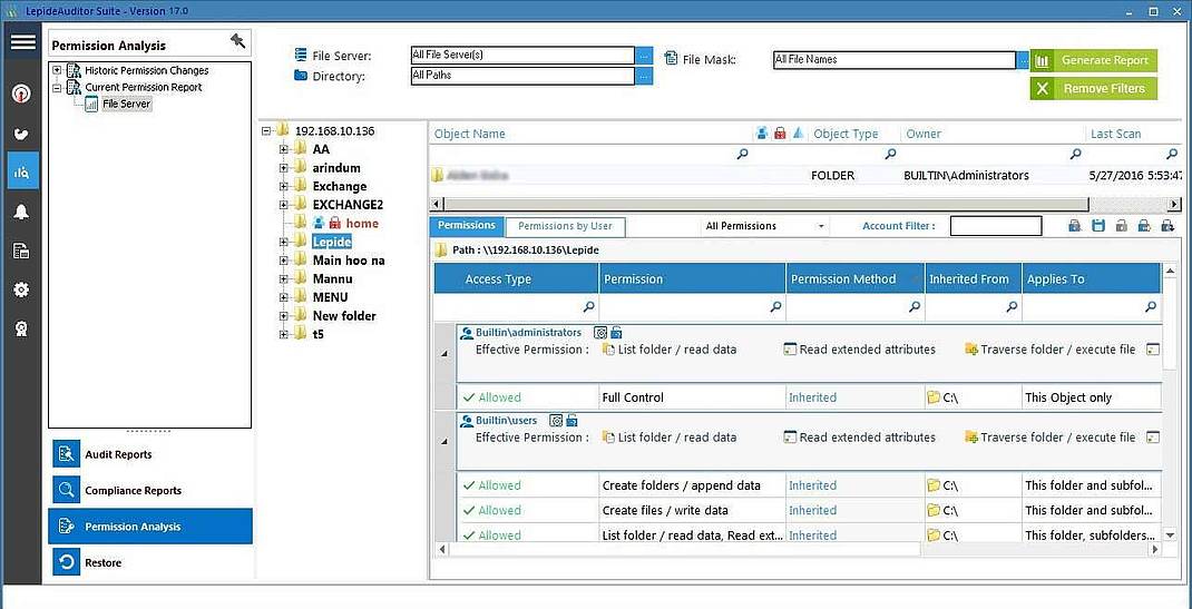 Lepide Auditor für File Server analysiert die aktuell gültigen Berechtigungen auf freigegebene Dateien und Ordner durch Gegenüberstellung von NTFS und den effektiven Freigabe-Berechtigungen. Dabei wird nicht nur die untersuchte Ordnerebene angezeigt, sondern auch alle Ebenen auf die diese Rechte vererbt werden inklusive der Angabe, ob die Berechtigung für diesen Ordner erstellt oder direkt bzw. indirekt vererbt wurde.