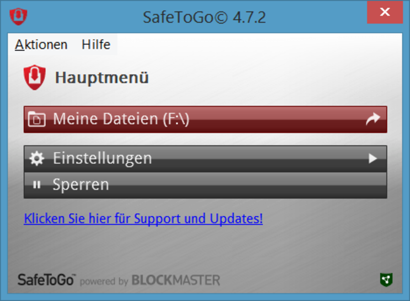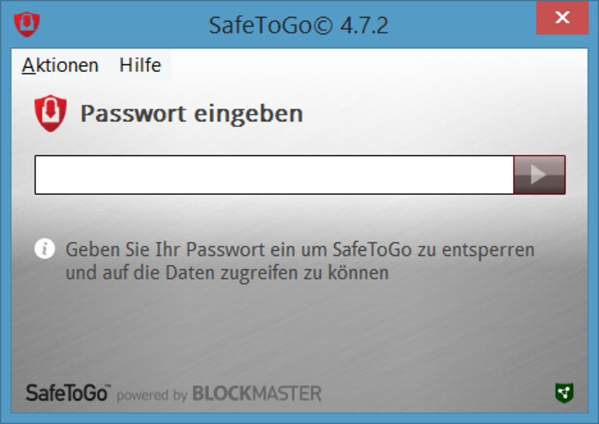 Der Windows und macOS (32-Bit bis 13.2) kompatible SafeToGo on-board Client, startet bei aktivierter Autorun-Funktion am Host System automatisch. Über die Software GUI gibt der Anwender das Entschlüsselungs-Passwort ein, wählt den Dialog aus den 9 verfügbaren Sprachen (bei SafeToGo Solo aktuell nur zwei Sprachen (Deutsch, Englisch)) aus und konfiguriert das Timeout-Intervall bei Inaktivität.