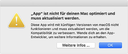 Haben Sie unter diesen Systemen versuchen, eine 32-Bit-App zu öffnen, so wurde Ihnen eine Warnmeldung angezeigt, die besagt, dass die App nicht für Ihren Mac optimiert ist oder dass der Entwickler sie aktualisieren muss, damit sie mit dieser Version von macOS funktioniert.